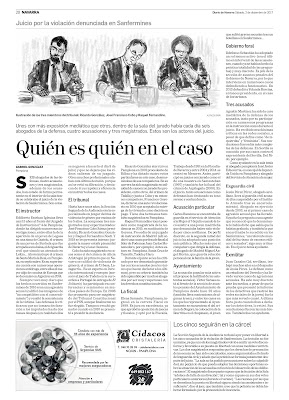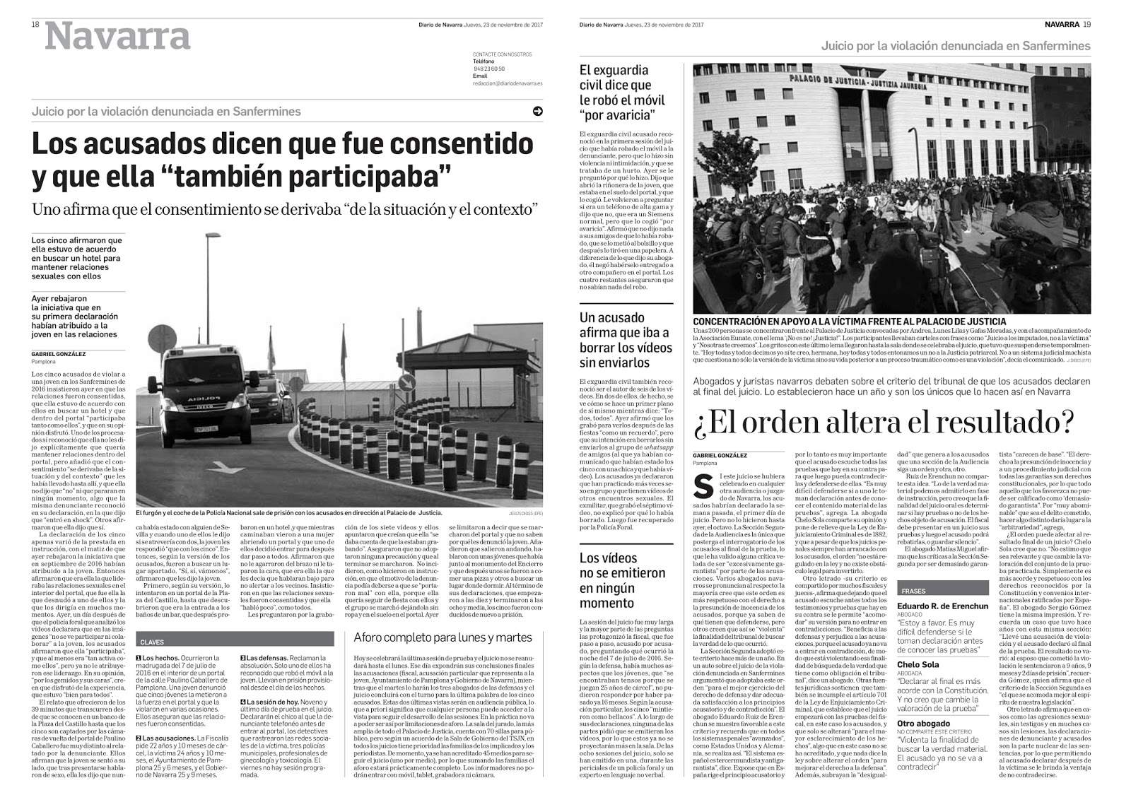 El gran tema informativo de hoy tiene lugar y hora: Pamplona, 13.00 horas. El presidente de la Sección Segunda de la Audiencia de Navarra leerá el fallo de la sentencia de la presunta violación grupal cometida en los Sanfermines de 2016. Dicho en términos más sencillos, se sabrá si los miembros de "La manada", en la cárcel desde entonces, son cupables o inocentes, sobre todo, de un delito de agresión sexual. Hemos querido recuperar la excelente cobertura del jucio que realizó Gabriel González en Diario de Navarra. Ninguna concesión al amarillismo. Cien por cien periodismo.