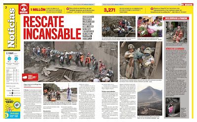 Íbamos a dedicar esta semana a mostrar páginas sobre el Mundial de fútbol. Lo haremos varios días. Pero no queremos retrasar la publicación, por ejemplo, de algunas páginas de la cobertura que realizó el guatemalteco Nuestro Diario —uno de los mejores diarios populares de América Latina— sobre el desastre provocado por la erupción del Volcán de Fuego al sur de la capital. Vale la pena recordar que hay 110 fallecidos identificados, más de 200 desaparecidos y más de tres mil desplazados en albergues provisionales.